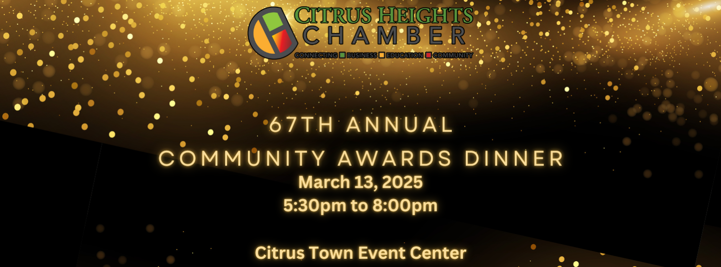 Join us for the 67th Annual Citrus Heights Chamber of Commerce Community Awards Dinner, an evening dedicated to honoring the extraordinary individuals and organizations that make our community thrive. We look forward to this elegant evening. (Cocktail or Business Professional Attire recommended)