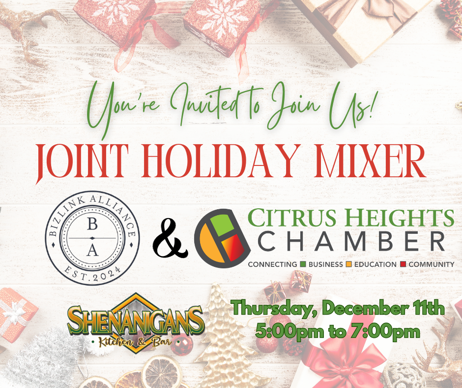 The Citrus Heights Chamber of Commerce and BizLink Alliance are teaming up for a Joint Holiday Mixer on Thursday, December 11th from 5:00 PM to 7:00 PM at Shenanigans Kitchen + Bar and you won’t want to miss it.